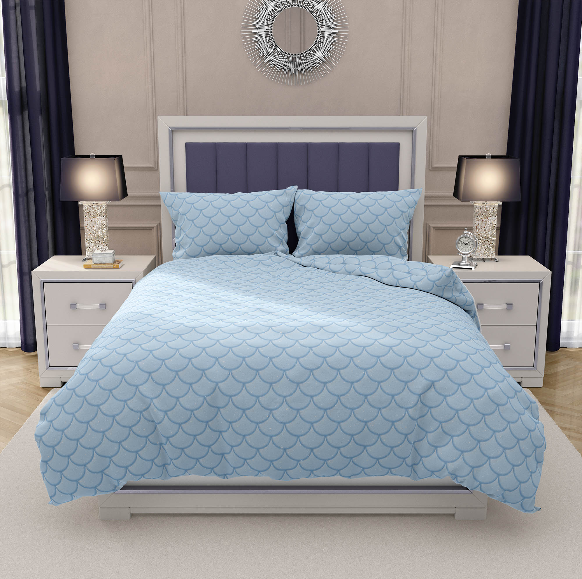Zamieszczona wizualizacja jest grafiką poglądową i przedstawia poszwę na kołdrę w rozmiarze 160x200 cm oraz poszwę na poduszkę 50x70 cm. Ze względu na różne ustawienia monitorów barwy widoczne na zdjęciach mogą nieznacznie odbiegać od kolorystyki gotowego produktu. Nasycenie danego nadruku może różnić się w zależności od rodzaju materiału, na jaki zostały naniesione. Na grubszych tkaninach nasycenie jest mniejsze.