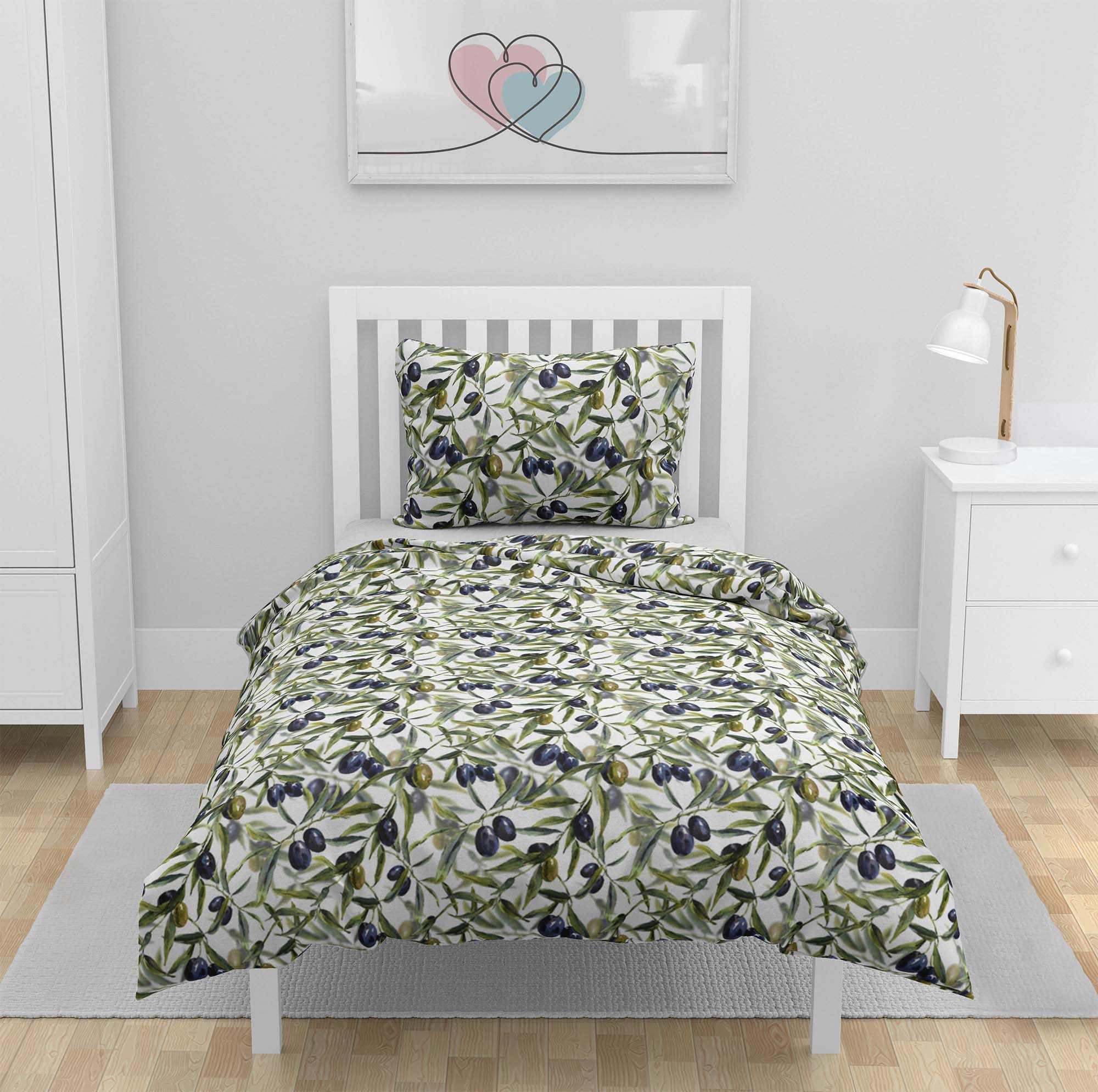 Zamieszczona wizualizacja jest grafiką poglądową i przedstawia poszewkę na kołdrę w rozmiarze 100x135 cm. Prosimy mieć na uwadze, że ze względu na różne ustawienia monitorów barwy widoczne na zdjęciach mogą nieznacznie odbiegać od kolorystyki gotowego produktu. Nasycenie danego nadruku może różnić się w zależności od rodzaju materiału, na jaki został naniesiony. Na grubszych tkaninach nasycenie jest mniejsze.