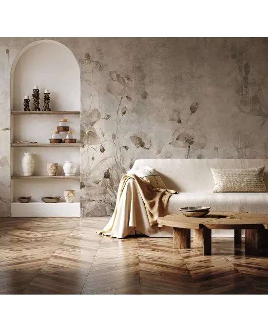 Motyw kwiatów został przedstawiony w sposób subtelny i nienachalny, co sprawia, że wzór doskonale współgra z różnorodnymi stylami aranżacyjnymi – od klasycznych po nowoczesne. Naturalna paleta barw wprowadza do przestrzeni poczucie równowagi, spokoju i eleganckiej prostoty.